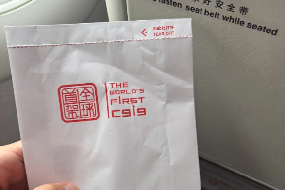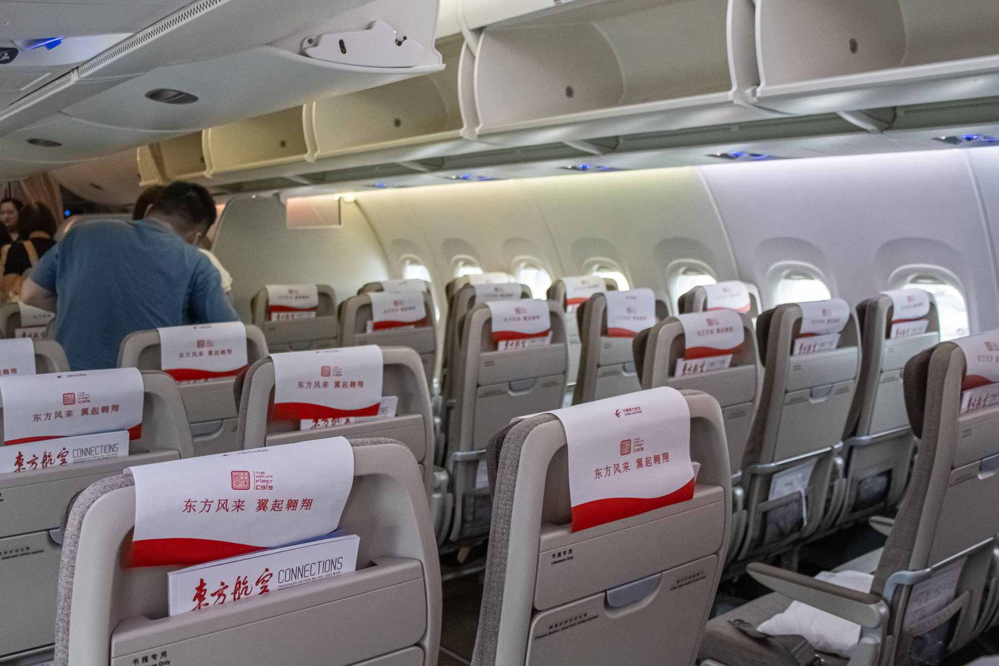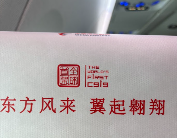 During the safety briefing, flight attendants drew attention to the aircraft, noting we were "flying on the COMAC C919, China's domestically produced commercial aircraft." The airline's pride in the aircraft even extended to the aircraft's decoration, with antimacassars written "The World's First C919."