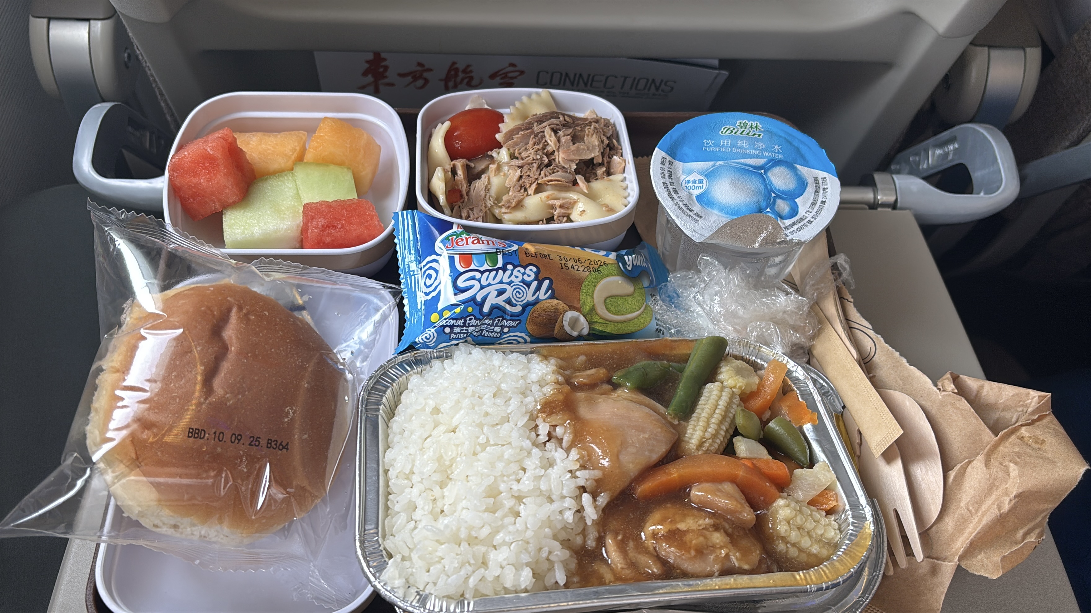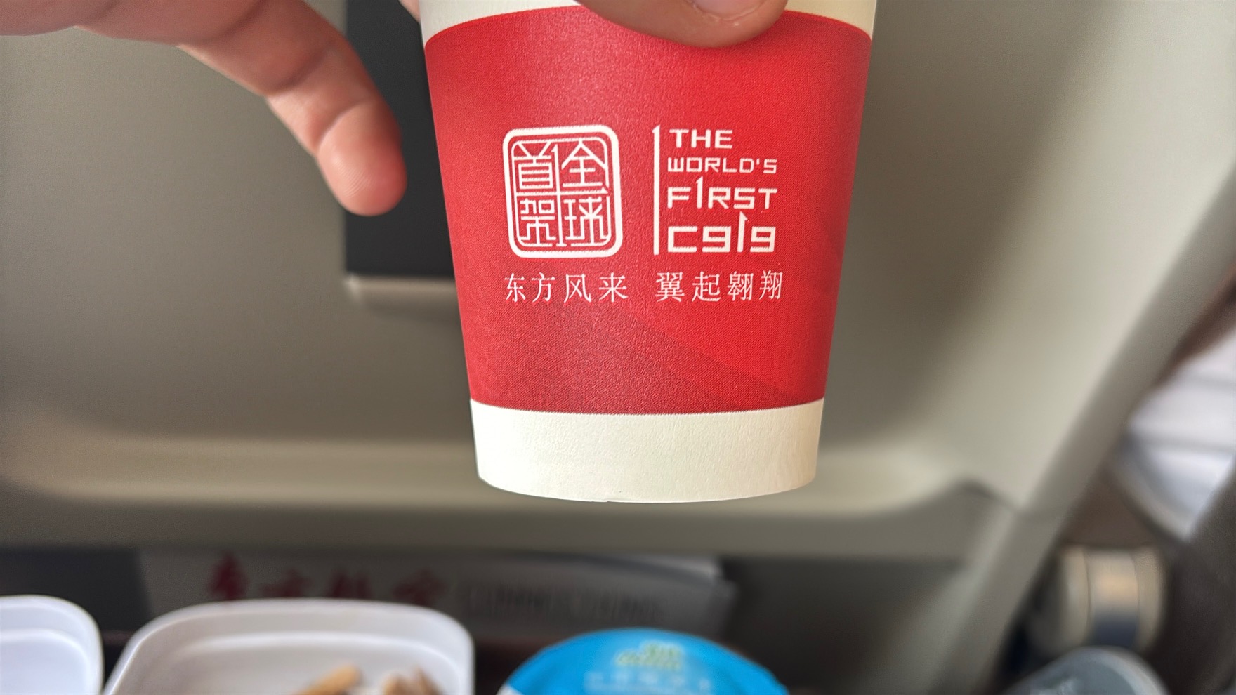 Besides the noise, the flight felt like any other: there was a full meal service, in-flight entertainment above every several rows, and a refreshment service, where flight attendants served drinks in cups labeled "The World's First C919."