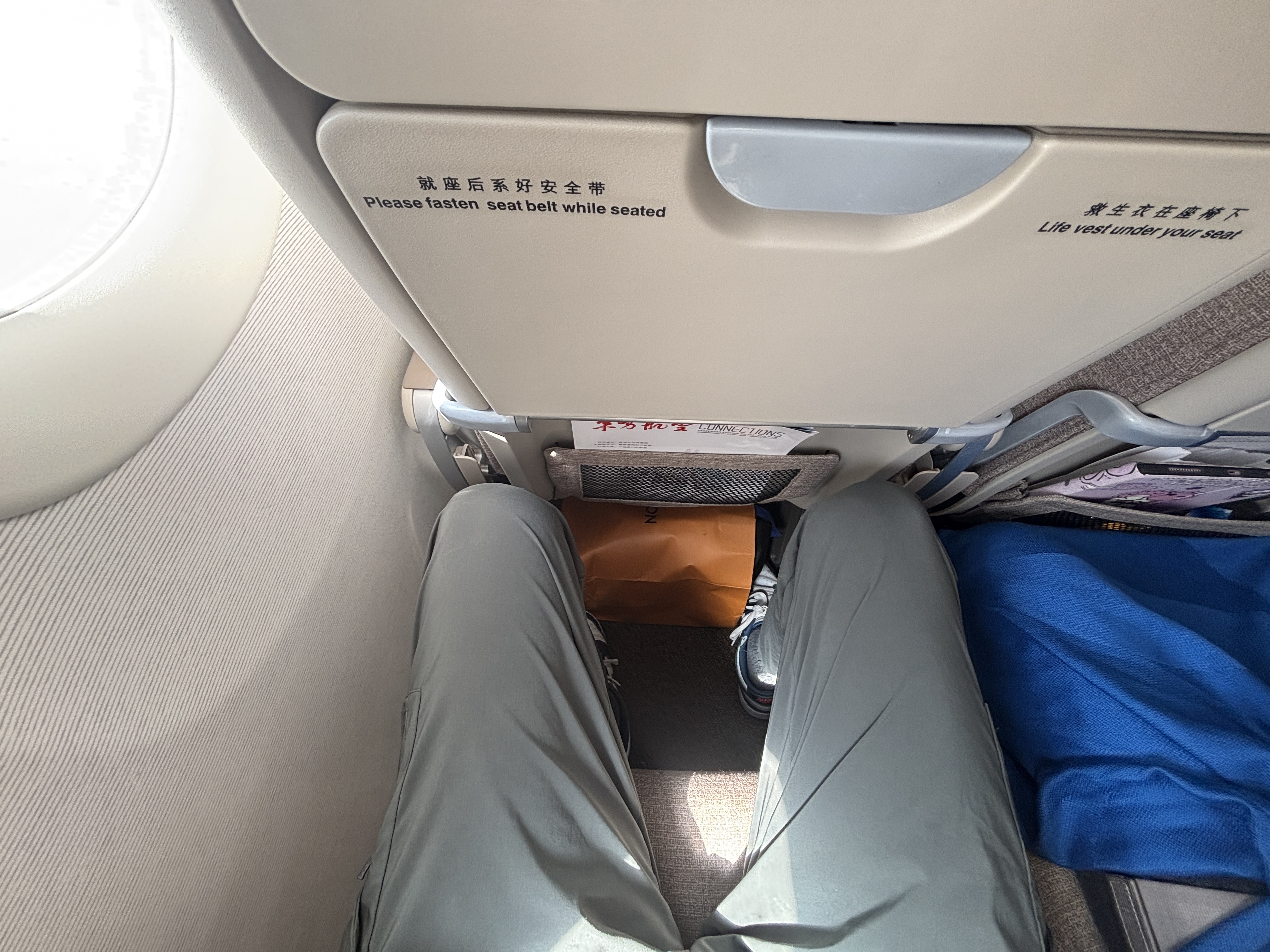 On the inside, the C919 looked just like its competitors: Two rows of business class in a 2-2 configuration and 26 rows of economy class in 3-3 cabin layout. The overhead bins were noticeably small, yet still workable. I remember on the 737, when the overhead bins could easily fit my carry-on with ample space above. Today, my bag barely fit.